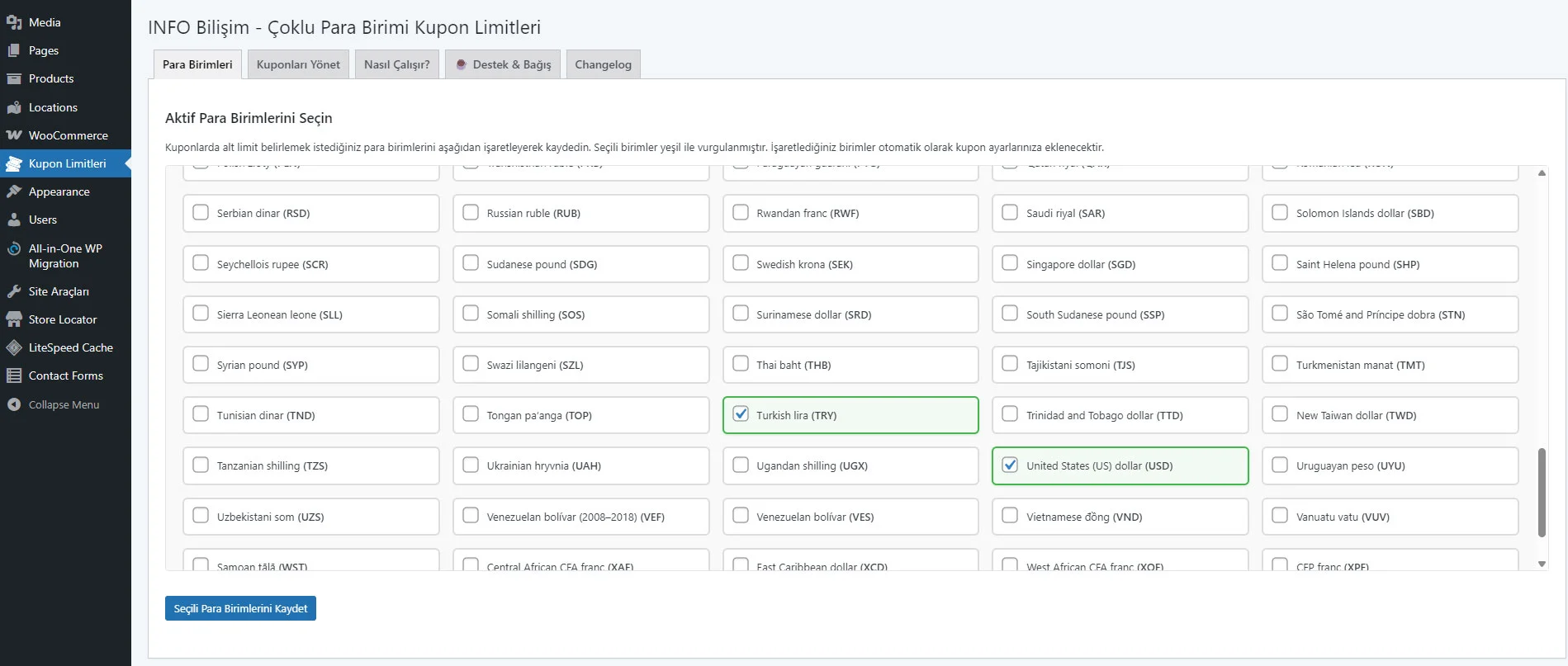 - Sitenizde işlem gören para birimleri (TRY, USD, EUR vb.) işaretleyip kaydedin.