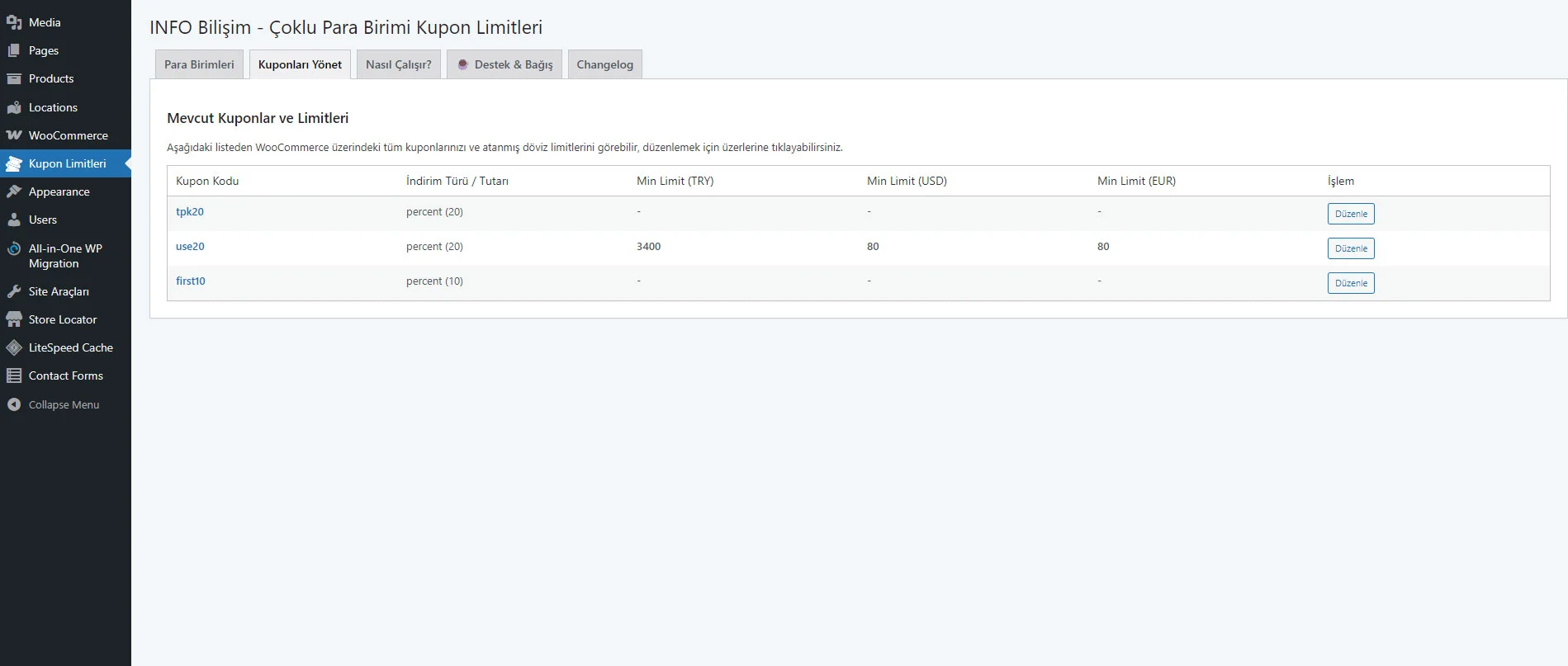 - Merkezi Kupon Yönetimi: “Kuponları Yönet” sekmesi sayesinde, sitenizdeki tüm kuponları ve hangi para biriminde ne kadar alt limite sahip olduklarını tek bir tablo üzerinden görebilirsiniz.